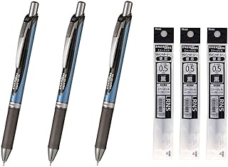 Pentel Kugelschreiber mit Gel-Tinte, EnerGel Knock Type 0,5, sehr dünn, BLN75-A, blaues Gehäuse, schwarze Tinte, Nachfüll-Tinte je 3 Stück