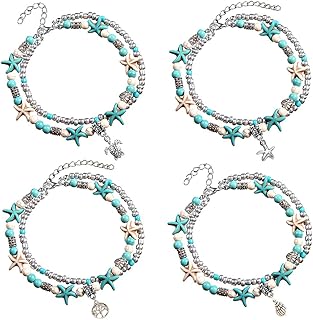4 Stück Fußkettchen Sommer Seestern Fußbändchen Schale Fuß Ketten Stilvoll Einfach Anklet Einstellbar Armbänder Böhmischer Kordelkette Fussband Strand Verstellbar Fußschmuck für Damen Herren